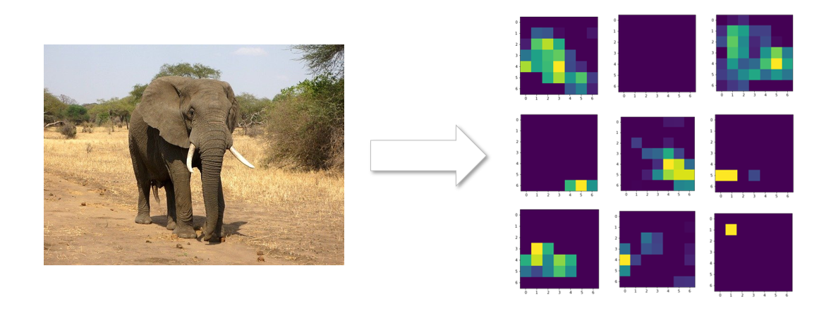 print(features.shape) # (1, 7, 7, 512) elephant.jpg 이미지 1개에 대한 512개의 피쳐가 7x7의 피쳐맵으로 구성되어 있습니다.
