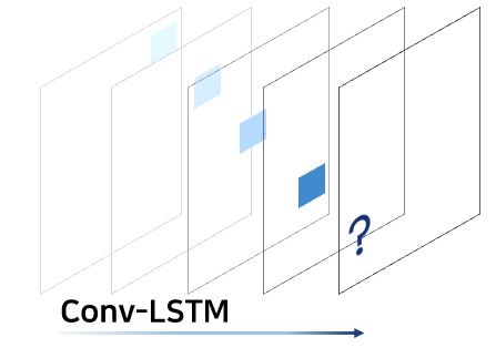 이 글은 Conv-LSTM 모델의 사용에 관한 글입니다. 이 모델은 가상으로 만든, 움직이는 사각형을 담고 있는 영상을 활용하여 그 다음 프레임을 예측하는 모델입니다.